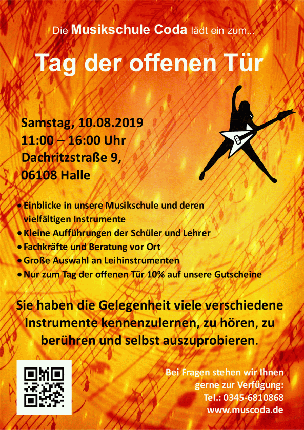 Aufgrund der aktuellen Vorgaben der Stadt Halle, wird der Schulbetrieb in der Musikschule Coda ab Freitag, dem 13.03.20, für die nächsten zwei Wochen (bis zum 27.03) eingestellt.